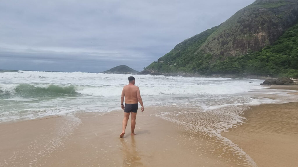 Postupně jsme vyjeli z města a vydali se stoupat silnicí do zarostlých zelených kopců. Po klikaté silnici jsme zdolali pár vrcholů, až se před námi objevilo údolí, jemuž dominovala dlouhá písčitá pláž Prainha ve tvaru půlměsíce. Počasí se změnilo, bylo sice vedro dál, ale už pod mrakem. Průvodce nás upozornil, ať se i tak pořádně namažeme opalovacím krémem, protože to opaluje i přes mraky. O pravdivosti jeho slov jsme se brzy přesvědčili na vlastní kůži, toho dne jsme byli všichni červení jako raci. První lenošení na pláži trochu kazily mraky a větší vlny, které dost zkalily deklarovanou křišťálovou vodu. Sice je tahle pláž vyhlášená, ale oproti plážím v Riu, tady dnes nebylo tak narváno. I když nám moře ukazovalo jaké umí být, i tak jsme se ve vlnách vyblbli.
