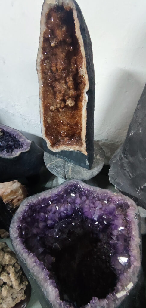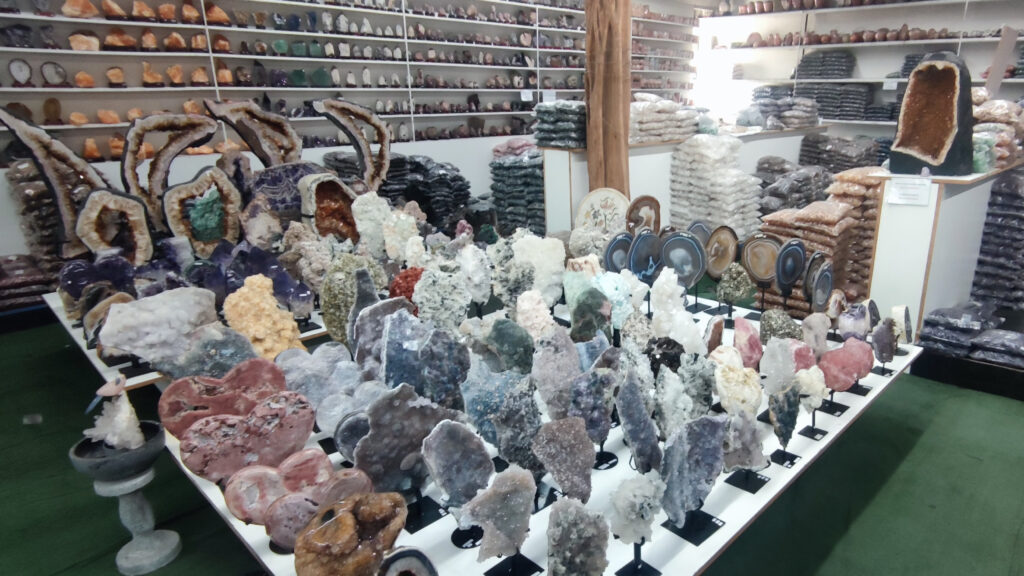 Nedaleko odtud byla dílna na zpracování nerostů, která nás překvapila velikostí své prodejní expozice. Zde si troufnu tvrdit, že každý si našel kámen, který ho nějak učaroval. Vzácné nerosty různých velikostí a tvarů hrály všemi barvami, byly opracované buď jako dekorace, případně byly použité do velké škály různých šperků. Také ceny se pohybovaly od lidových až po vysloveně astronomických. Nakonec jsme byli rádi, že jsme odjeli, protože bychom tady nechali všechny peníze a to jsme byli na začátku dovolené. 😀