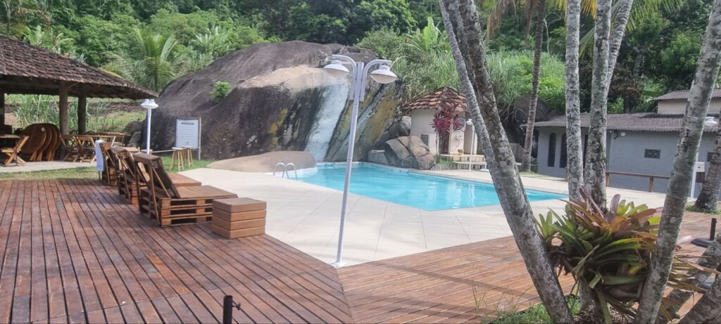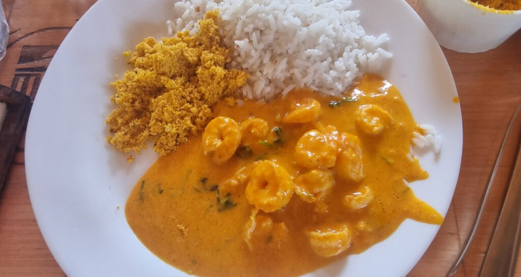 Asi po půl hodině jízdy jsme narazili v kopcích na restauraci, kde jsme měli domluvený pozdní oběd, specializovali se na plody moře. Ochutnal jsem typické brazilské jídlo vatapá, krevety v kokosové omáčce, podávané s rýží a se strouhankou. Servírovali nám to v kotlíku, z kterého se s klidem najedlo více osob. Naštěstí i zde měli ledově vychlazené pivo, dokonce Heineken, takže naše potřeby byly nasyceny. 😉