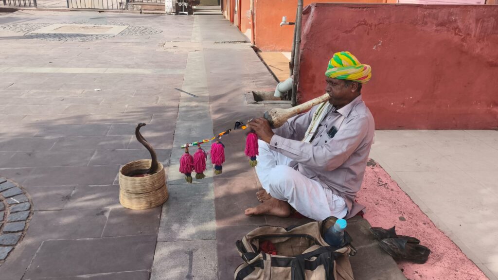 V košíku před ním v rytmu zvuku reagovala vztyčená černá kobra a společně s pohybem píšťaly vytvářely dojem tance. Na chvíli mě ten výjev úplně paralyzoval. A hadí mistr si toho všiml — běloch v tranzu? Ideální okamžik na výběr dolaru. 😄