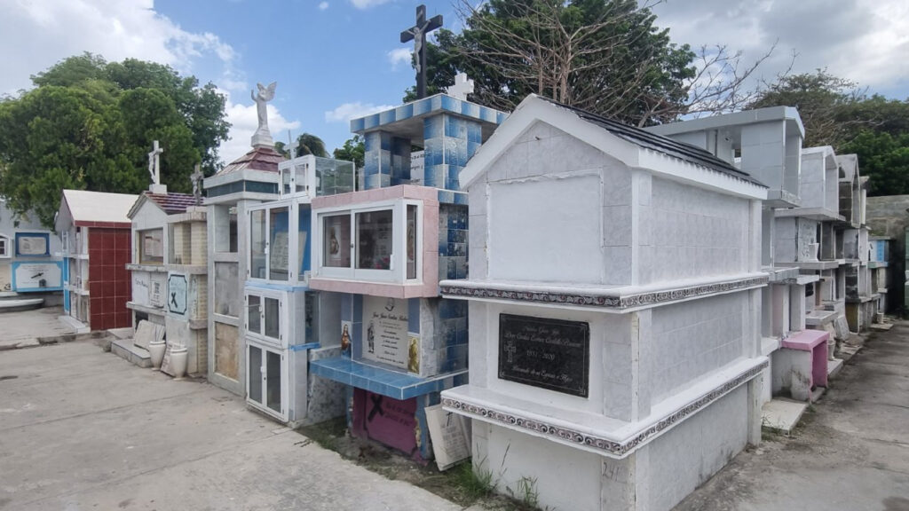 Cestou jsme udělali ještě jednu zastávku, hodně rozdílně tématickou. Navštívili jsme typický mexický hřbitov, který nás už u vchodu vítal barevnou výzdobou. Přeplněný hřbitov, plný různě velikými a rozmanitě zdobenými hroby. Zde se pohřbívá, oproti našim končinám, nad sebou, proto tu byly všude patrové hroby, různě barevné, nebo zdobené kachličkami či mozaikami z nich. Byly tu i honosné kusy, zdobené sloupy a obtěžkány samými sochami. Škoda, že jsme tu nezažili El Día de Muertos, svátek mrtvých, to teprve musí být zážitek. 😉