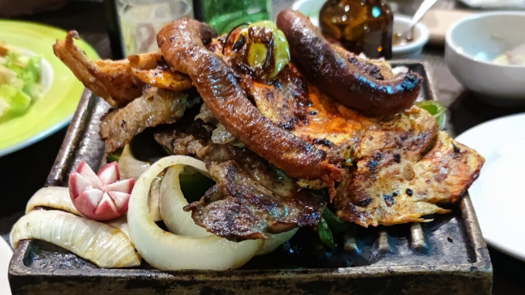Objednali jsme si samozřejmě místní specialitku a jelikož hlad měl velké oči, tak volba padla na místní smíšený gril. Různá grilovaná masa, od kotlet, prsou, steaků a doplněná klobásou a zeleninou. Prý se z toho nasytí dvě až tři osoby, úplně s klidem. O porci si udělejte názor sami, ale měli jsme i tak co dělat, abychom jako češi neudělali v zahraničí ostudu. 😉 😀 K jídlu nám přišli zahrát i místní umělci, mariachi, aby atmosféra byla dokonalá.