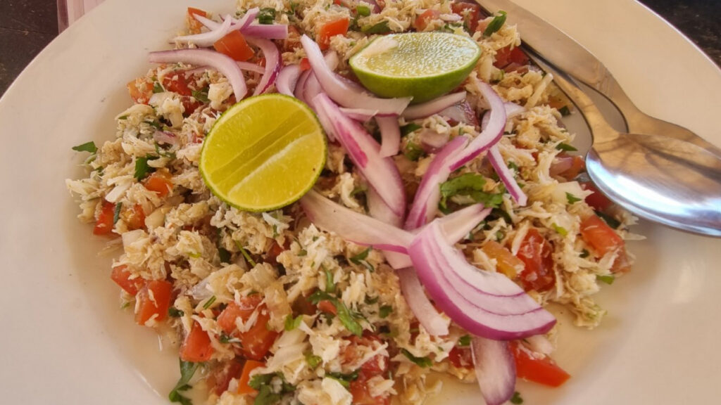 Obsadili jsme stoly pod stylovými slunečníky, objednali si oběd a pití a šli poprvé vyzkoušet vodu zálivu. Labůžo, jak jinak to popsat. 😀 Příjemně teplá průzračná voda, skoro bez vln, nám dávala možnost pozorovat pestrý život drobných rybek a krabů na dně. Když jsem si lehl na hladinu, krásně mě voda nadnášela a já mohl relaxovat pohledem na plující mráčky na modré obloze. Vydržel bych tady hodně dlouho, ale jedině pěkně namazaný, protože slunce opravdu pěkně pražilo.
