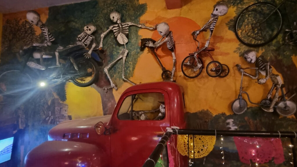 Chvíli jsme procházeli uličkami, které žily svým životem i teď, když byla už tma. Monika nás dovedla k vyhlášené restauraci La Parrilla Colonial, která mě uchvátila krásnou výzdobou zdí interiéru. Všude byly tématické lidské kostry v různých situacích, například jako řidič čehokoliv, od kola po auta.